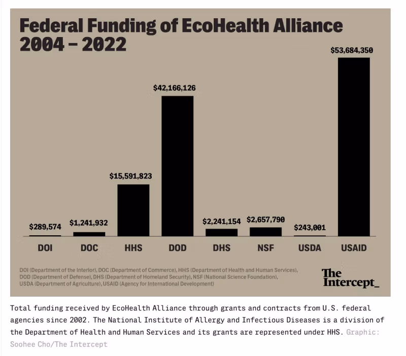 De financiering van de EcoHealth Alliance van de Amerikaanse overheid, die volgens Daszak zo'n 80 procent van de begroting uitmaakt, is de afgelopen jaren ook gegroeid. Volgens een Onderscheppen Na analyse van openbare registers heeft de organisatie ruim 118 miljoen dollar aan subsidies en contracten ontvangen van federale agentschappen, waarvan 42 miljoen dollar afkomstig is van het Ministerie van Defensie. Een groot deel van dat geld is echter toegekend via programma’s die niet gericht zijn op gezondheid of ecologie, maar op de preventie van biologische oorlogsvoering, bioterrorisme en ander misbruik van ziekteverwekkers..