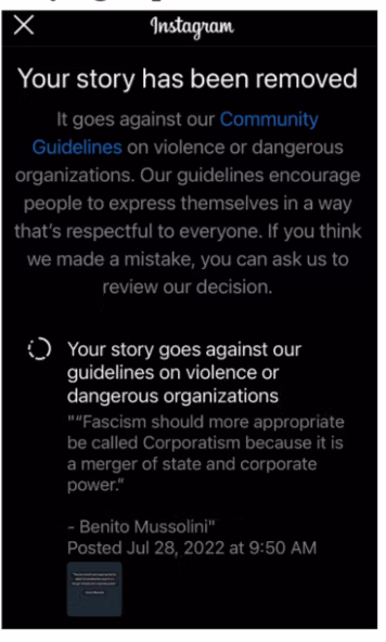De ironie zit diep: particuliere bedrijven claimen onafhankelijkheid terwijl ze optreden als verlengstukken van de staatsmacht. Denk aan onze eigen ervaring: het posten van Mussolini's definitie van fascisme als "de fusie van staats- en bedrijfsmacht" – alleen om laat Meta het verwijderen als “misinformatie.” Dit was niet zomaar censuur; het was meta-censuur: het tot zwijgen brengen van discussies over de controlemechanismen die werden ingezet.