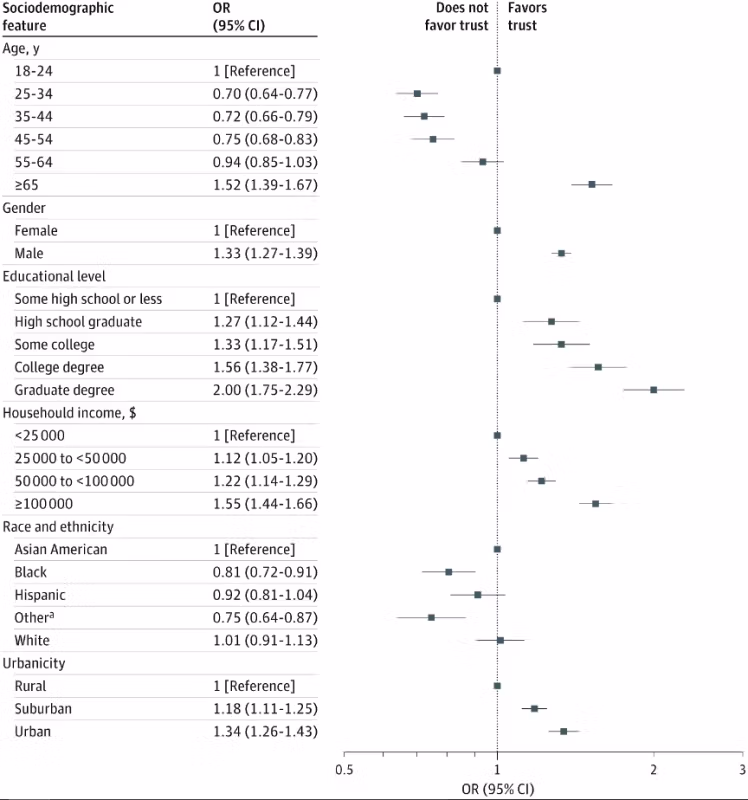 nieuwe papier in JAMA analyseert enquêterespondenten in de VS over de periode direct na het begin van de Covid-pandemie in april 2020 en tot begin 2024. Het onthult een aanzienlijke daling in vertrouwen in artsen en ziekenhuizen, van 71.5% in april 2020 tot 40.1% in januari 2024. Lagere vertrouwensniveaus werden sterk geassocieerd met een verminderde kans op het ontvangen van Covid-19-vaccinaties en -boosters. Totale schok, toch?