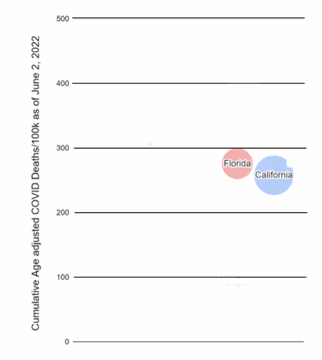 Afb. 2. Aan leeftijd aangepaste COVID-19-sterfgevallen in Florida en Californië. De cirkels zijn proportioneel aan de staatsbevolking. Hoewel deze staten een dramatisch verschillend beleid voerden, hadden ze vergelijkbare resultaten.
